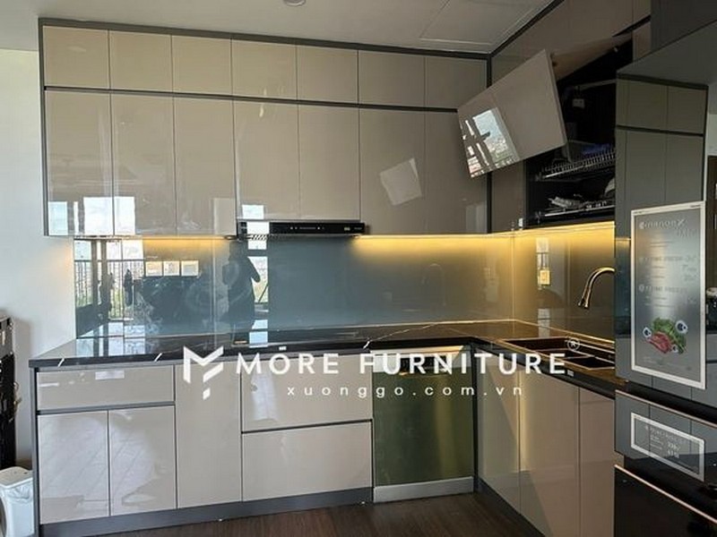 2. Tủ bếp acrylic bóng gương tạo cảm giác sang trọng, dễ dàng vệ sinh và giữ được vẻ sáng bóng theo thời gian. Chất liệu này giúp không gian bếp thêm hiện đại và bắt mắt.