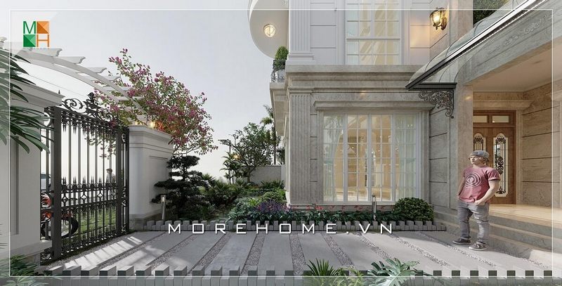 Khoảng sân trước nhà rộng rãi kết nối cổng với biệt thự, mang lại cảm giác thoải mái và hấp dẫn.
