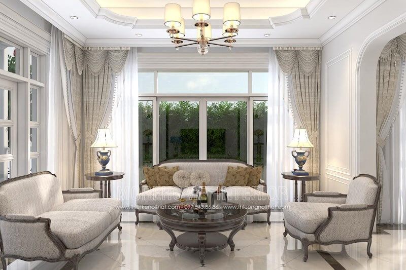 Không gian phòng khách của biệt thự, nhà phố được thiết kế sang trọng và đẳng cấp, cùng với sofa tân cổ điển gỗ óc chó kết hợp vỏ bọc da màu kem, tạo nên một cảm giác ấm cúng và ấn tượng.
